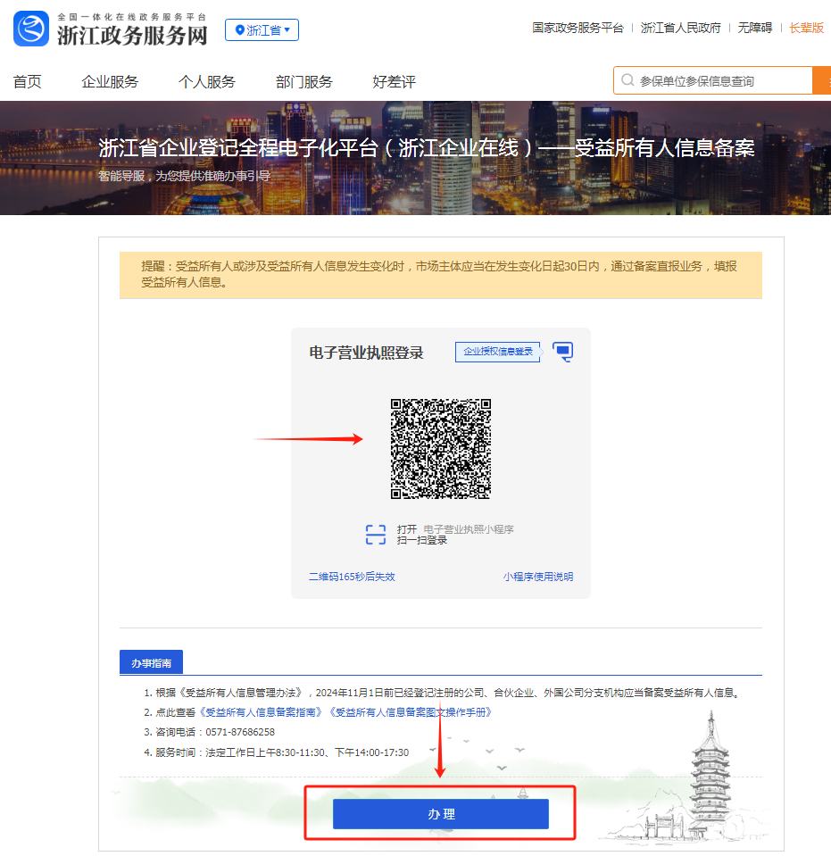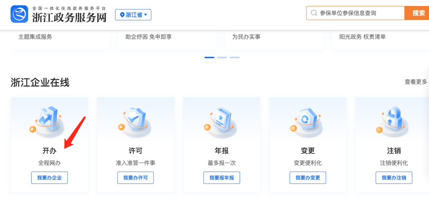 方式二:电脑端登录“浙江政务服务网”,网址为:https://www.zjzwfw.gov.cn/,在“浙江企业在线”模块,点击“开办”或“变更”进入登录界面,使用个人用户或者法人用户登录。