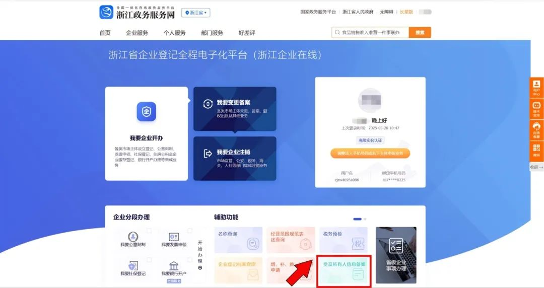成功登录后,进入“辅助功能”中的“受益所有人信息备案”模块。